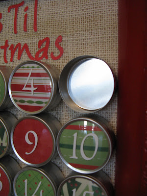 I glued some metal tins to the burlap covered backing and added some scrapbooking paper and vinyl numbers to the tops of the tins.