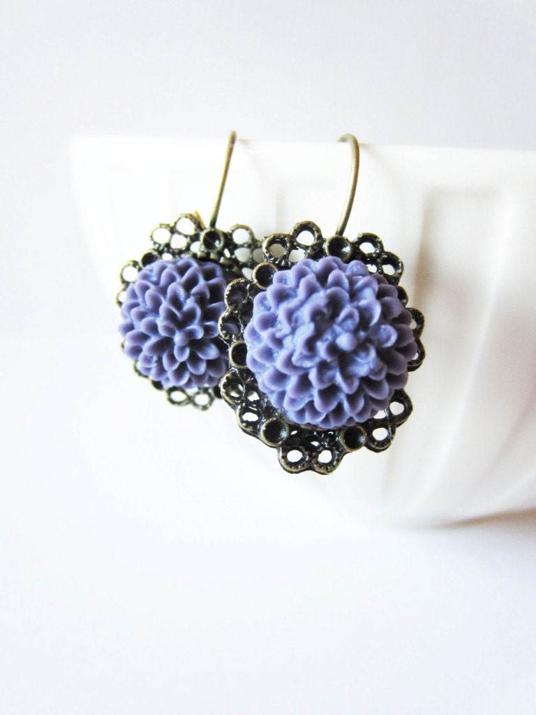 Blueberry mum and brass lace dangle earrings