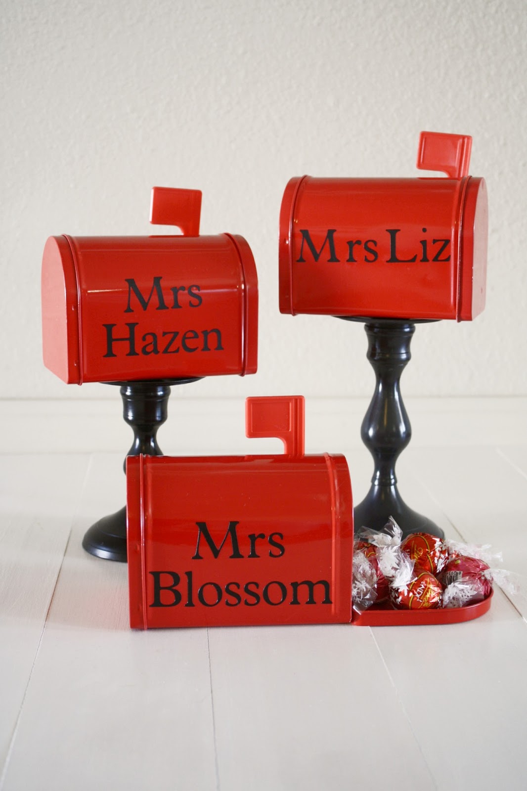 These were the Teacher’s Valentine’s gifts from my kiddos this year! I grabbed some red mailboxes at Target, added each Teacher’s name in black vinyl to the sides, and filled them with yummy chocolates!!! I think they loved them and I know my kids were very excited to give them!!!