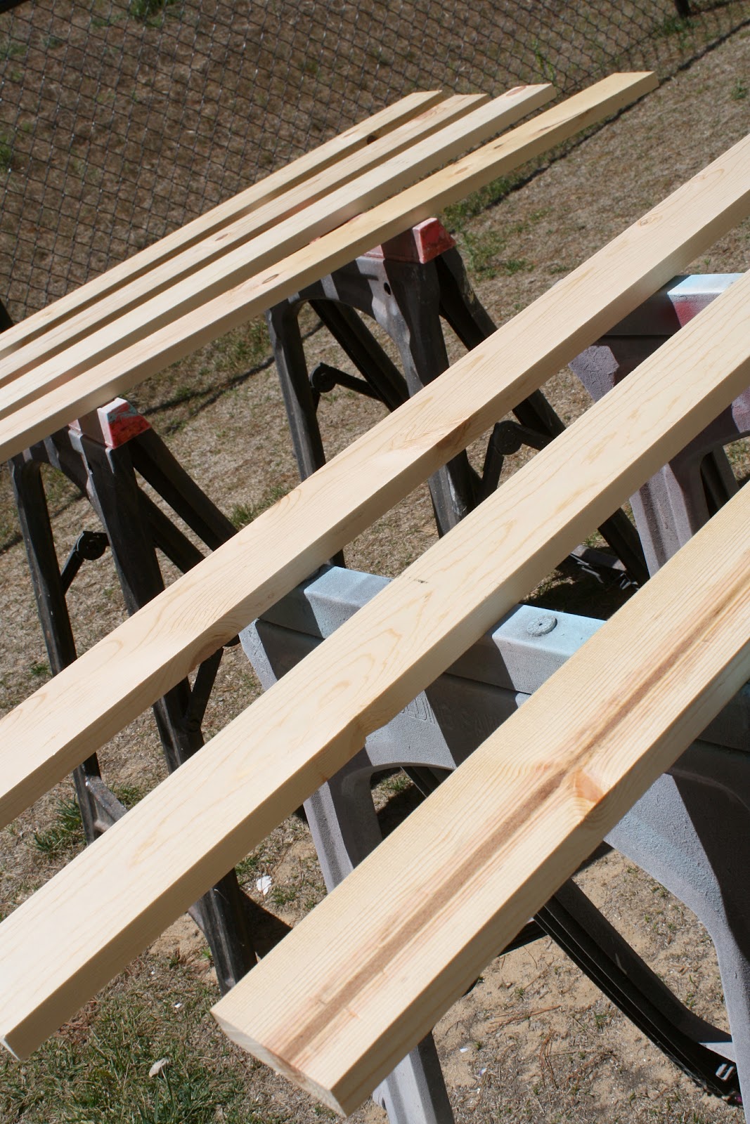I knew I wanted to cover up that blah pressboard coffee table top. The first step was very nicely asking the hubbster to help me cut some 1×4’s. We cut them to the length of the old coffee table top, with a little over hang.