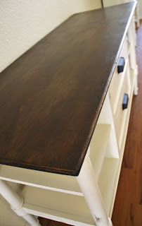 After the legs were stained and painted, I ruffed them up a bit with some sandpaper. Then they were attached using two L brackets on each leg. Pretty simple right?