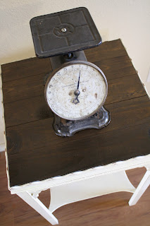 While the wood stain and poly was drying I whipped up some creamy DIY Chalk Paint. I am loving the pairing of white furniture with stain wood combo. I painted the coffee table with the chalk paint and did a bit of distressing.