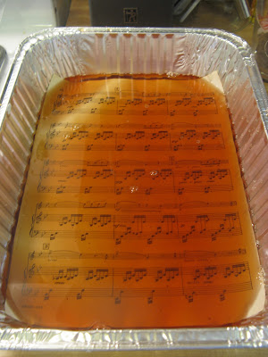 I decided to tea stain my sheet music. Ideally I would have a huge stack of beautiful antique sheet music with just the perfect amount of aging. Until I can figure out how to make the world perfect, I have to stick to tea staining my paper!