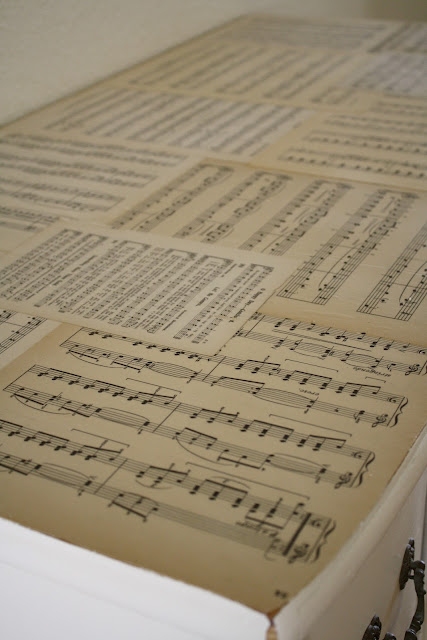 There was a notch cut out all around the top of the table that made me want to do something to the top. It sat in my garage for a bit while I thought it over. Sometimes I just have to let projects sit for a bit while I make up my mind. It finally came to me that I wanted to use sheet music. There is a good amount of sheet music floating around the blog world these days and for good reason! It’s beautiful!