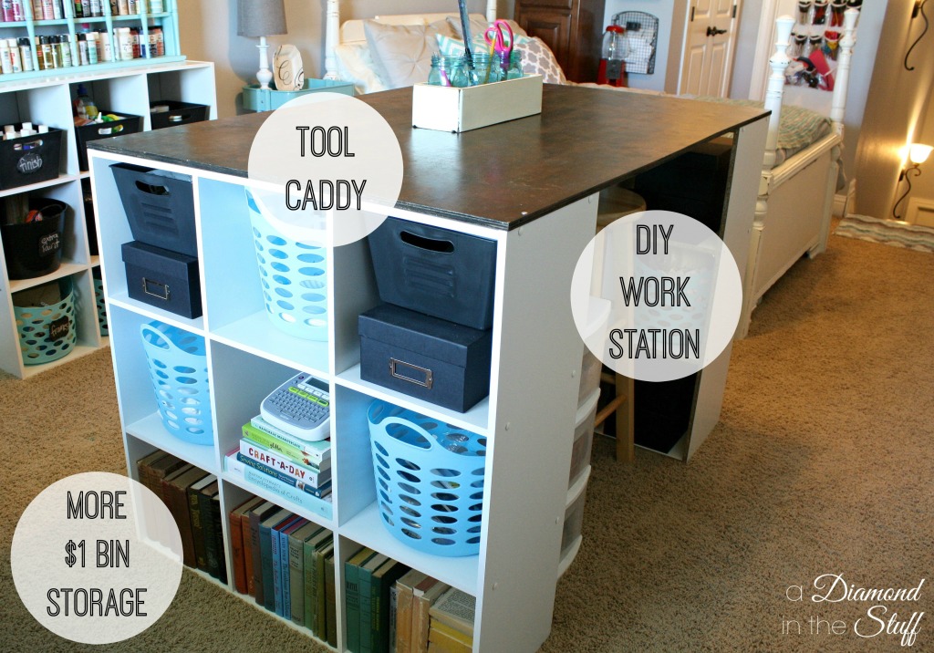 My DIY work station is the heart of my craft room. I am often perched on a bar stool hovering over my latest project. My hubby and I made it with two storage cubs and a big piece of plywood. It has proven to be not only a great source of storage but the perfect work space.