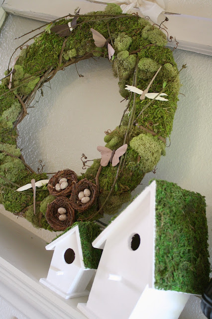 I added my two Moss Birdhouses that I made a couple weeks ago. Because we obviously needed more moss around here right??? Right. They look perfect next to my Moss Wreath.