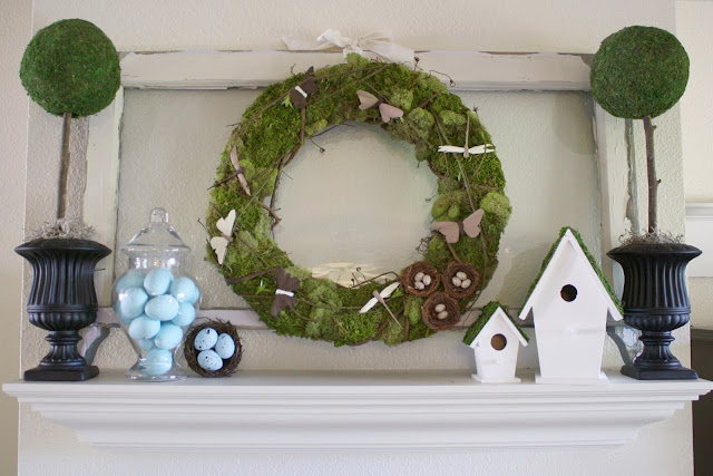 Now my Spring Mantel contains some of my most favorite Springtime things: moss, birdhouses, nests, and robin’s eggs.
