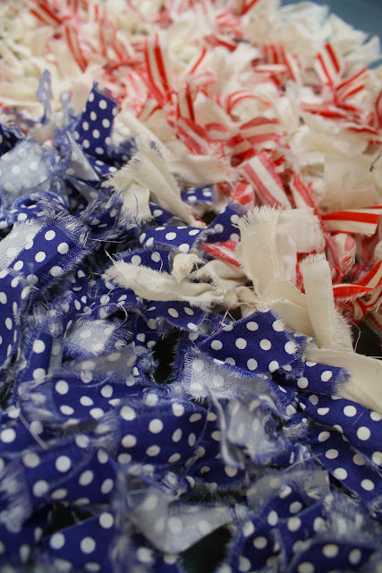 First thing I did was head to the fabric store. I picked up some blue dotted fabric, red striped fabric, and some muslin to make my rag wreath. I think I ended up using about 2 1/2 yards of fabric. Then I cut out a flag shape (aka: a rectangle) of chicken wire from my roll. It ended up measuring 25 x 16 inches.