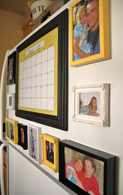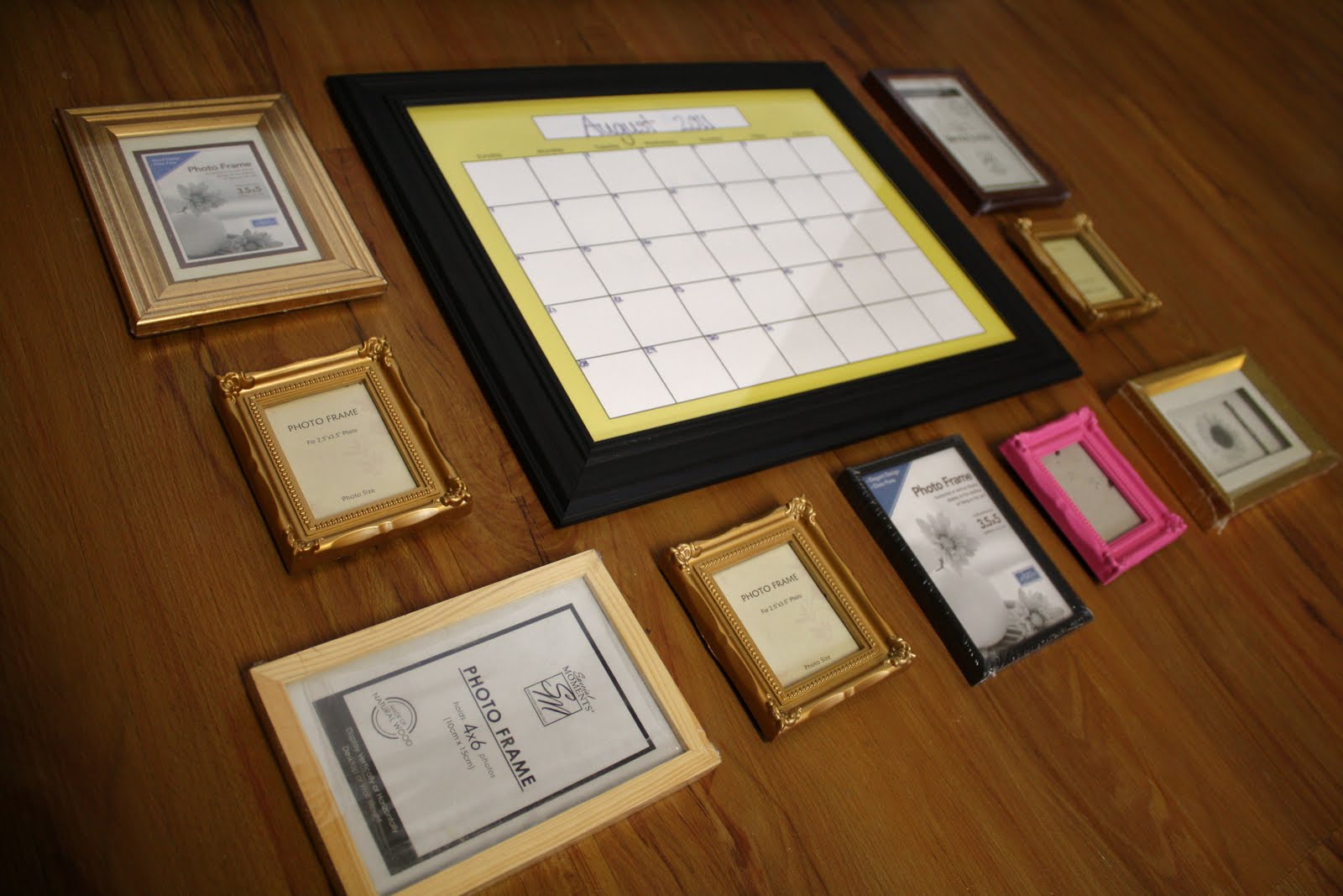 I decided I wanted to be able to frame all the pictures. I scoured my stash for random small picture frames from the dollar store. I laid all the frames and the calendar out on the floor to see how I wanted the layout to be. Then I painted them all to match my kitchen decor.